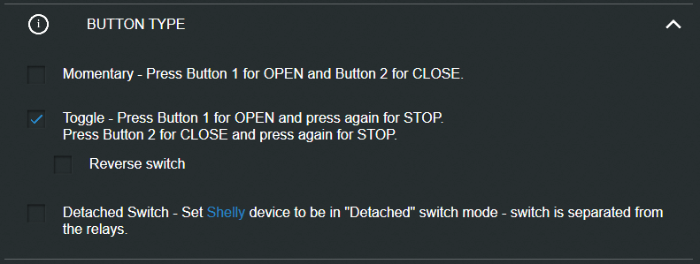 Detached Switch - Detached mode is used when you don’t want the physical switch that is wired to the Shelly to directly control the electrical consumer, but instead you’ll use the “action” menu, or MQTT, API, ect. to control some sophisticated action.