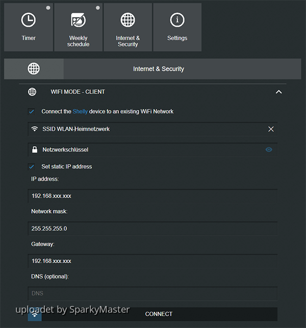 - Haken setzen: "Connect the Shelly device to an existing WiFi-Network"
