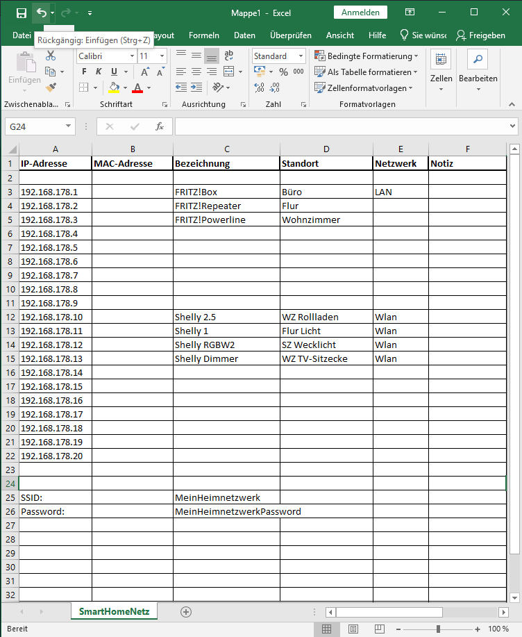 - alle bereits vergebenen IP-Adressen notieren (am Besten Geräte-Excel-Liste erstellen und pflegen!)