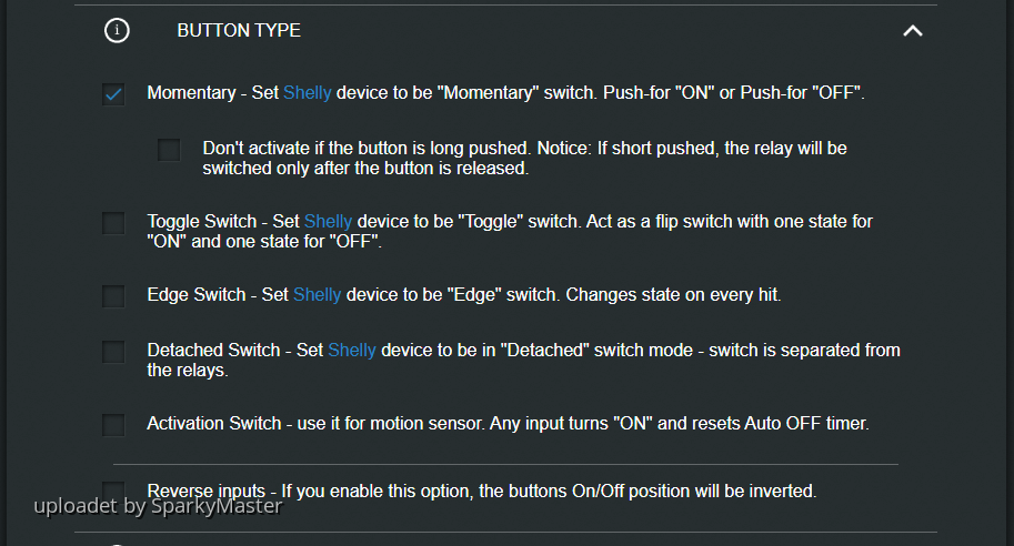 Momentary - Stellen Sie den Shelly als Taster (Stromstoß-Schalter) ein. 1x Tasten für "EIN" oder 1x Tasten für "AUS".