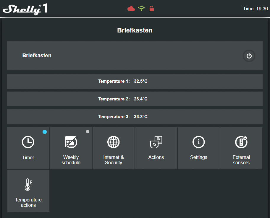 Timer / Weekly Schedule / Internet & Security / Actions / Settings siehe: Einstellungen im Shelly-Hauptmenü