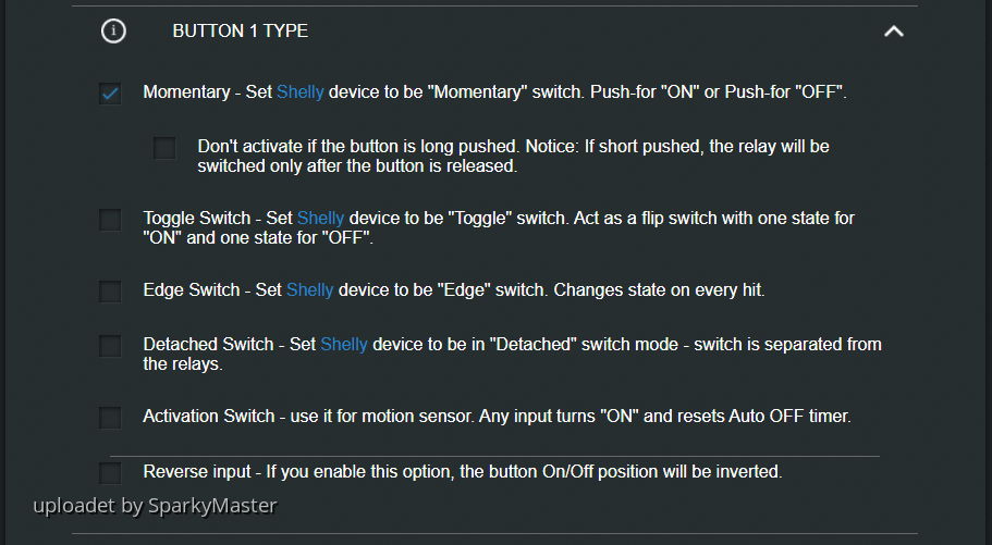 Momentary - Stellen Sie den Shelly als Taster (Stromstoß-Schalter) ein. 1x Tasten für "EIN" oder 1x Tasten für "AUS".