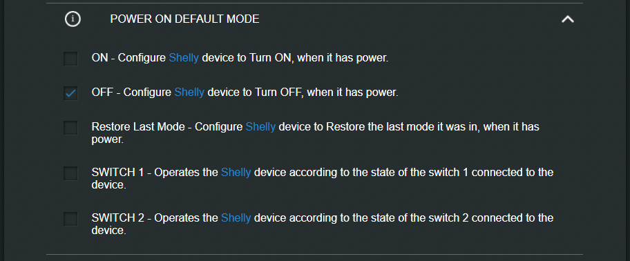 Toggle Switch - Stellen Sie den Shelly auf "Kippschalter". Eine Schalterstellung für "EIN" und die andere Schalterstellung für "AUS".