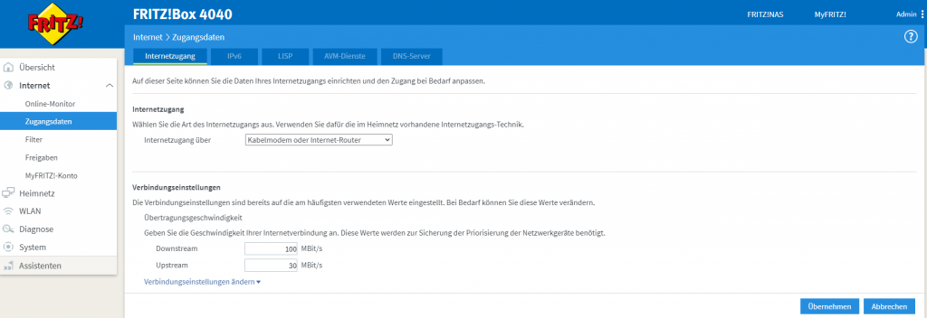 - Internet/Zugangsdaten/Internetzugang: "Kabelmodem oder Internet-Router" (Bezeichnung kann von Box zu Box variieren!)