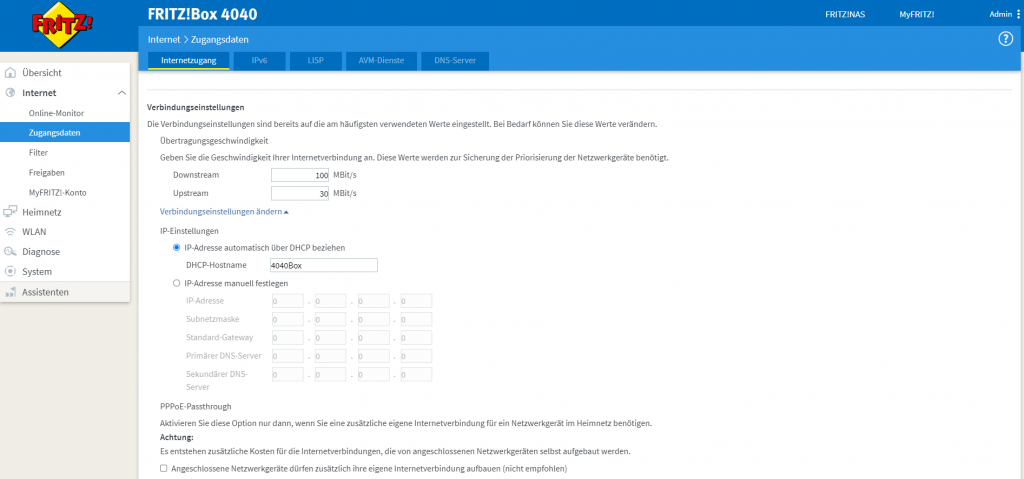 - Internet/Zugangsdaten/Internetzugang/Verbindungseinstellungen: "IP-Adressen automatisch über DHCP beziehen"