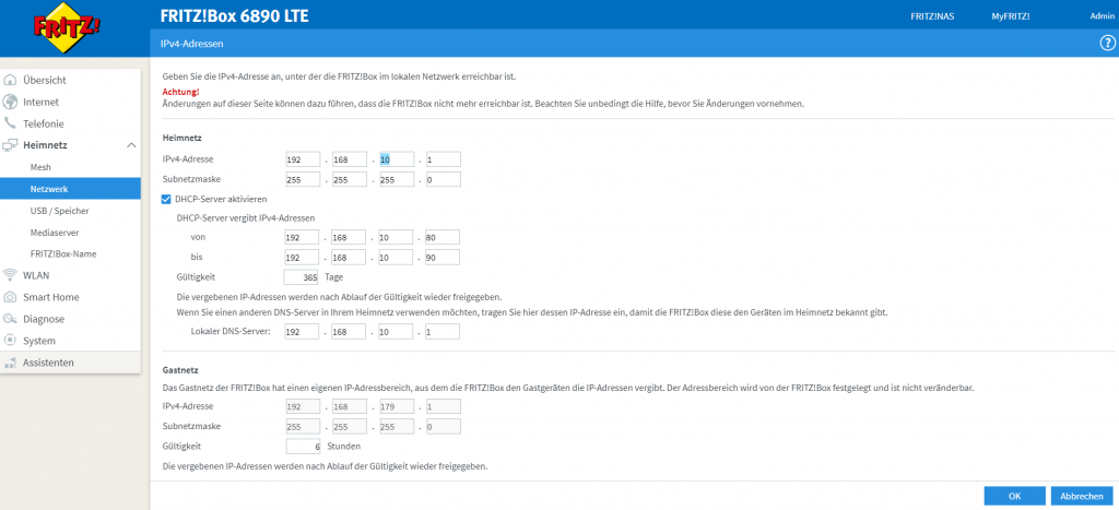 - Router 1: FRITZ!Box 6890lte (Netzwerk 1 / Hauptnetz) -> IP-Adressbereich 192.168.10.xxx
