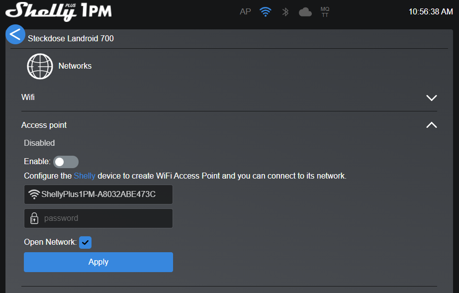 • Dazu den Shelly als Access Point konfigurieren, eigene SSID und Passwort vergeben.