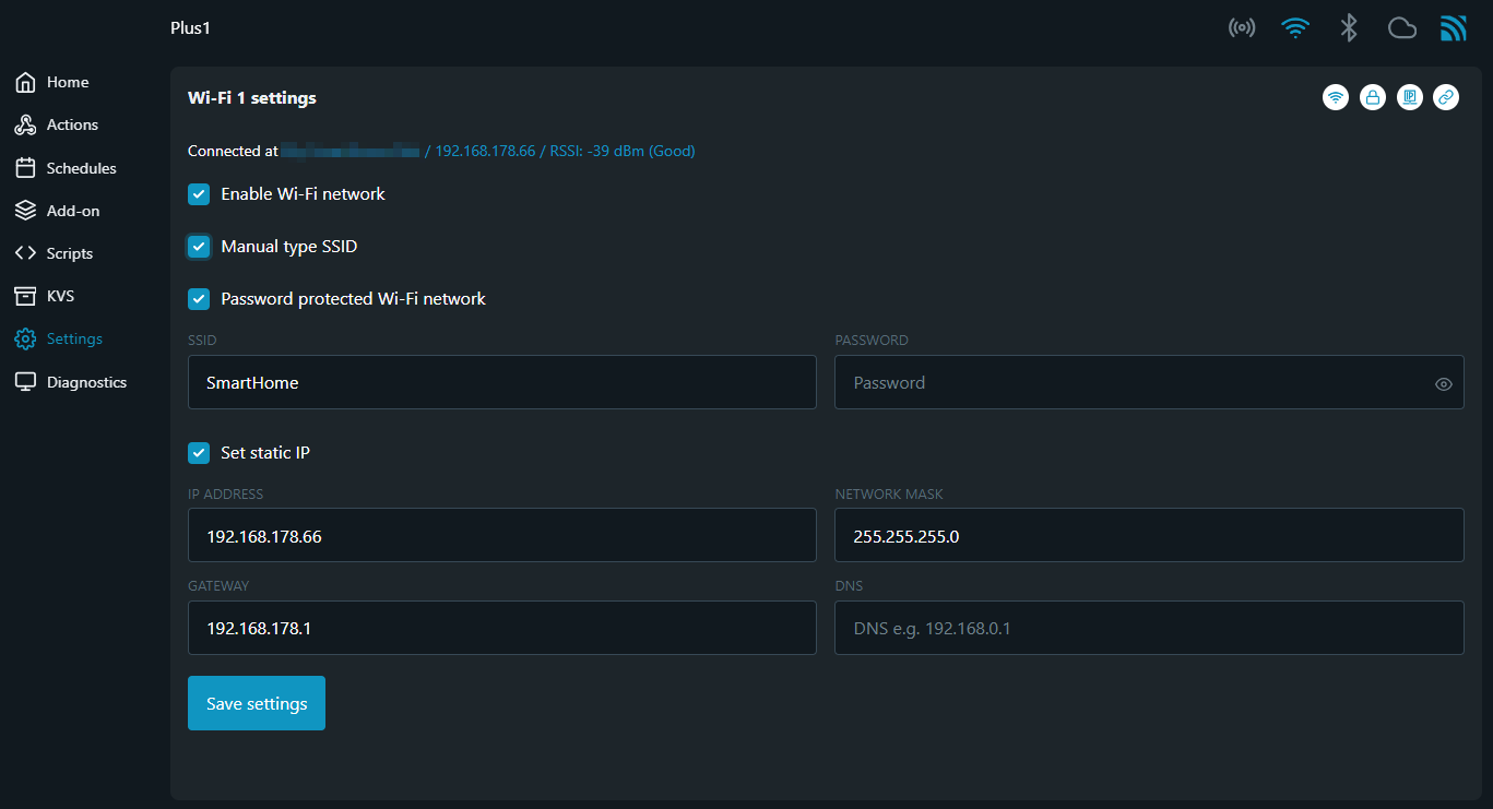 - Der Shelly erstellt seinen eigenen WiFi-Zugriffspunkt. Die SSID wird aus dem Gerätetyp und der Shelly-ID gebildet, z.B. ShellyPlus1-A803D67G4BB9