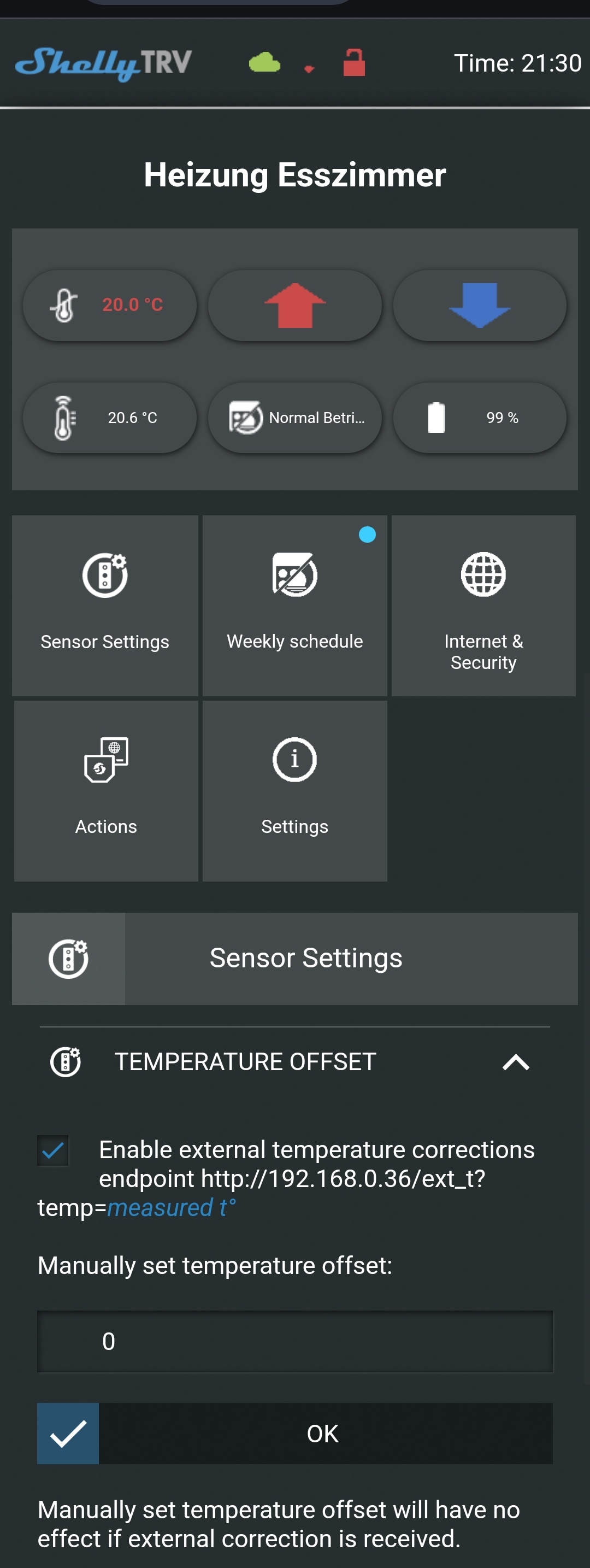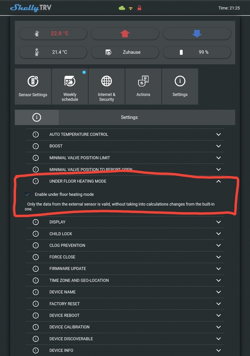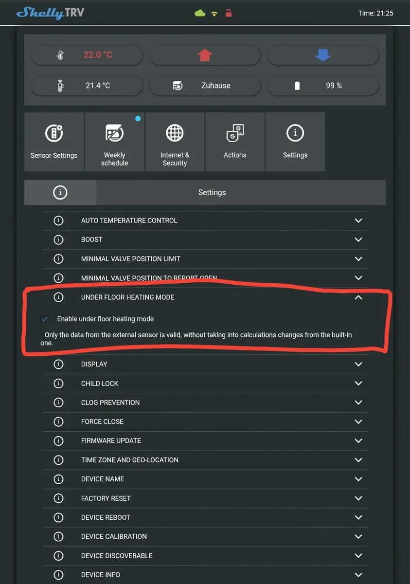 Das bei der TRV nur die Daten des externen Sensors (Shelly Plus H&T oder Shelly H&T Gen3 in diesem Fall) gültig sind, ohne Berechnungen des eingebauten Sensors zu berücksichtigen, muss zusätzlich im TRV selbst noch Under floor heating mode (Fussbodenheizung) aktiviert werden: