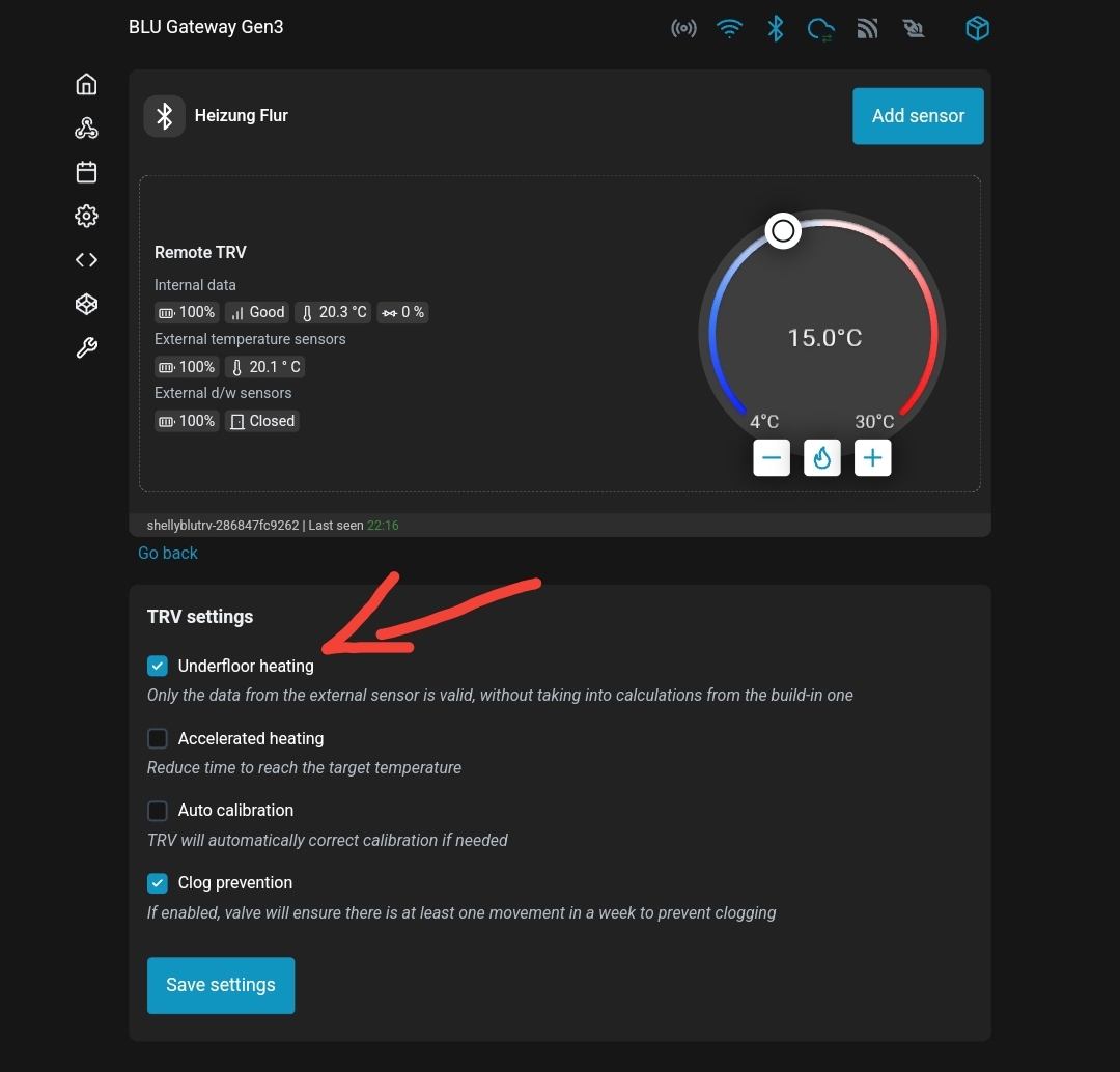 3. Nach erfolgreicher Verbindung können sie in der Weboberfläche des Shelly BLU Gateway 3 auf der Startseite beim TRV den External temperature sensor sehen: