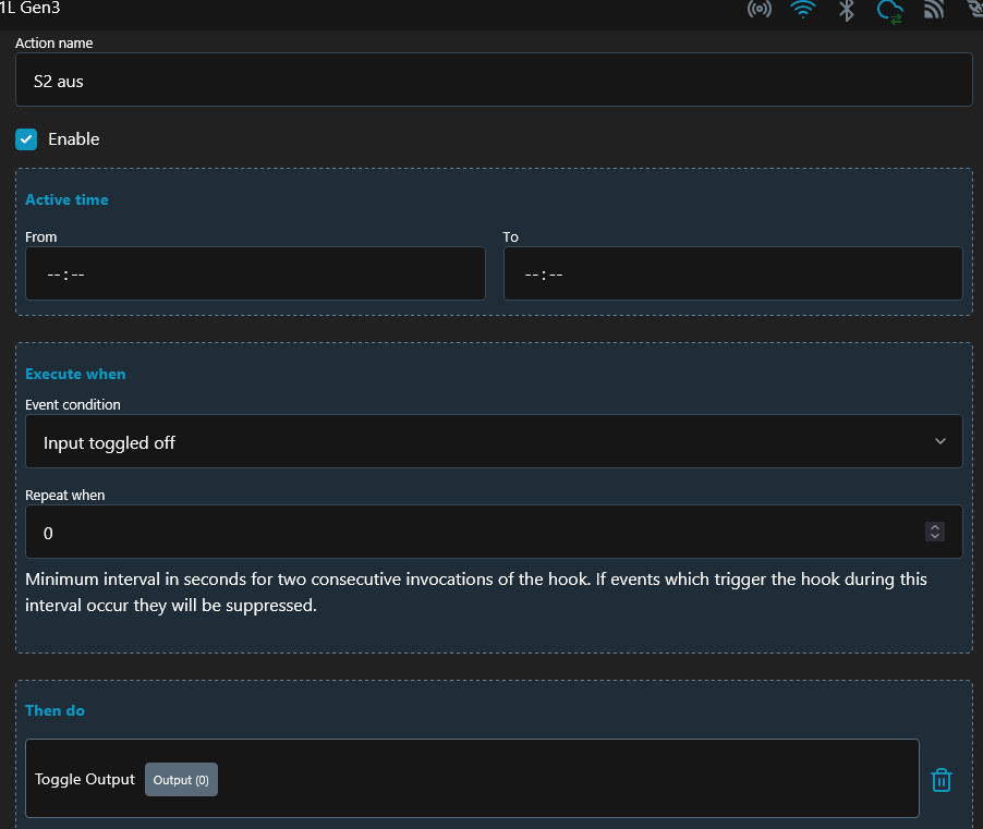 Then do: Auf +Add action to execute klicken, bei Action Toggle Output auswählen, dann Save local Action und zum Schluss in der Übersicht Save drücken.
