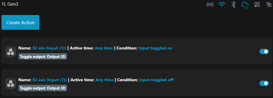 Im Gegensatz zum „alten“ Shelly 1L , der ohne weiteres Zutun mit S1/S2 an einer ehemaligen, modifizierten Wechselschaltung arbeitete, muß man beim Shelly 1L Gen3 zwei „Actions“ einrichten: