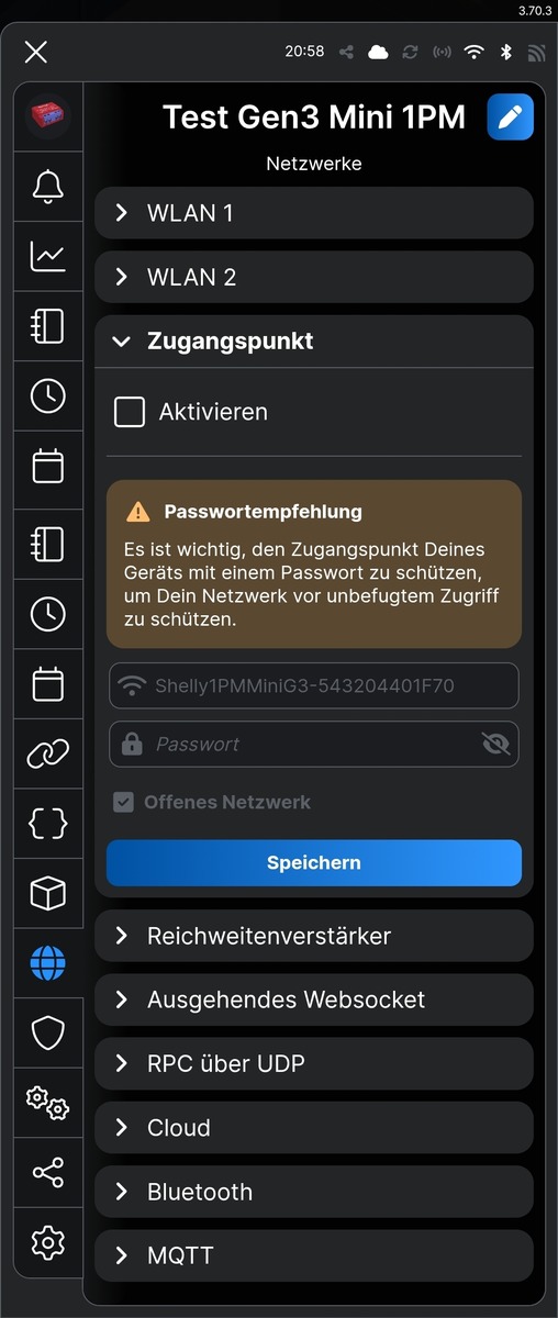- Wenn diese Option aktiviert ist, erstellt das Gerät sein eigenes WLAN-Netzwerk (normalerweise mit einem Namen wie shelly-device-xxxxxx).