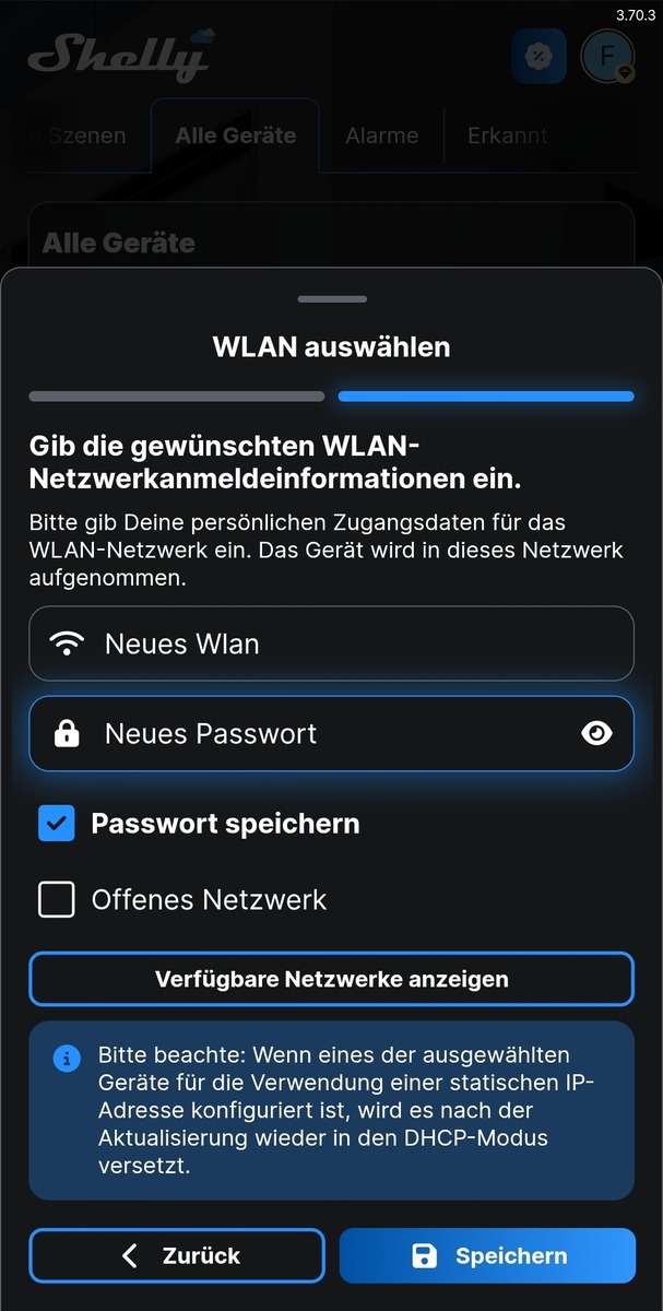 - Bestätigen Sie die Änderung. Die Shelly-Geräte werden automatisch aktualisiert und verbinden sich mit dem neuen WLAN.