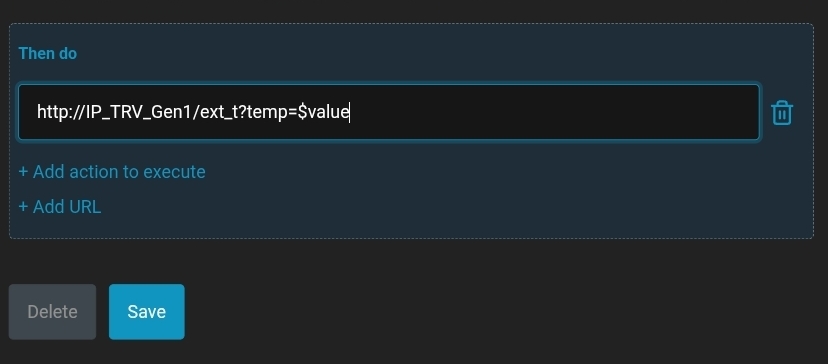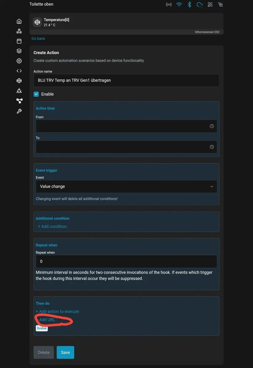 Wählt im aufgehenden Fenster dann Temperature[0] aus, und ihr gelangt auf das Action Erstellmenü, wo ihr oben einen Namen für die Action vergiebt, und anschließenden unten bei Then do auf Add URL drückt:
