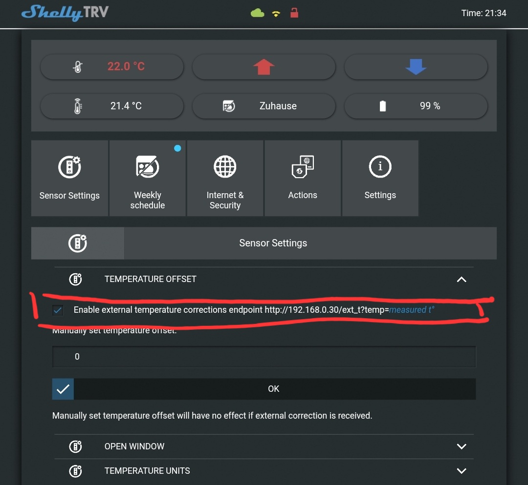 Zuerst müsst ihr im Shelly TRV unter Sensor Settings --> Enable external temperature (Externe Sensoren) aktivieren: