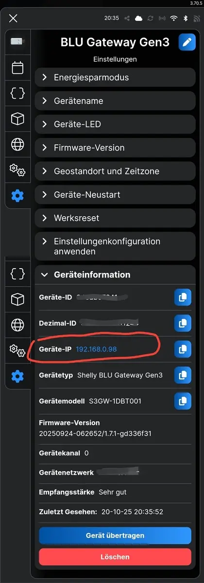 1. IP Adresse des Shelly BLU Gateway Gen3, wo der Shelly BLU TRV mit verbunden ist. Zu finden in der App, im Shelly BLU Gateway Gen3 unter Einstellungen -> Geräteinformationen: