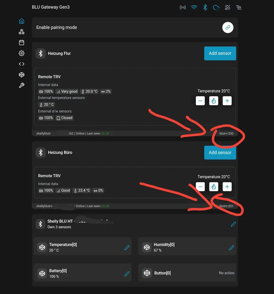 2. Eure BLU TRV ID des Shelly BLU TRV, zu finden, ab FW 1.6.x unten Rechts beim Shelly BLU TRV in der WebUI des Shelly BLU Gateway Gen3: