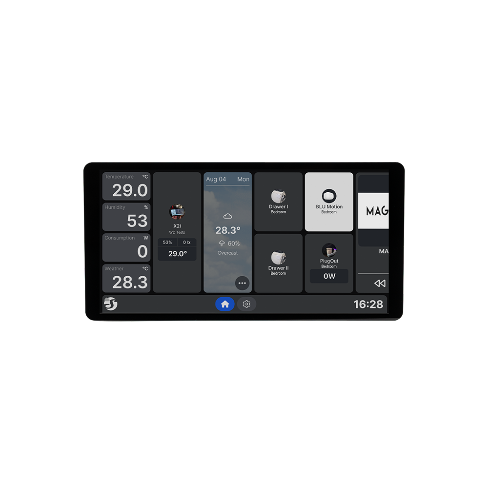 Von einem schnellen Quad-Core-Prozessor angetrieben, vereint das Shelly Wall Display X2i Stil und Leistung in einem 6,95"-Farb-Touchscreen, Dank des austauschbaren Strommoduls bietet es maximale Flexibilität – ob für Relaissteuerung, USB-Stromversorgung oder zukünftige Modulerweiterungen. Steuere Deine Beleuchtung, Geräte und mehr präzise und mühelos – sogar berührungslos über den integrierten Gestensensor. All das mit einer intuitiven Benutzeroberfläche, die sich lokal oder über WLAN, MQTT und Home Assistant verbindet – ganz ohne Cloud-Zwang.
