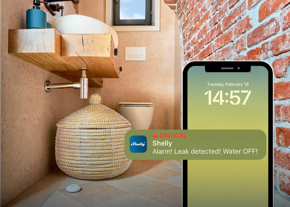 In Kombination mit Shelly Flood-Sensoren schließt das Ventil automatisch die Hauptleitung, sobald Wasser erkannt wird.