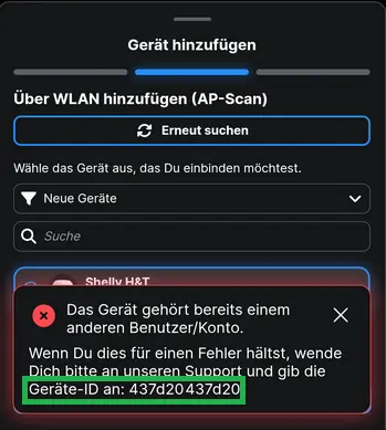 Von Zeit zu Zeit kann es zu Problemen kommen, wenn Sie versuchen, ein Shelly Gerät zur App hinzuzufügen und die Meldung "Das Gerät gehört bereits einem anderen Benutzer/Konto" erhalten .