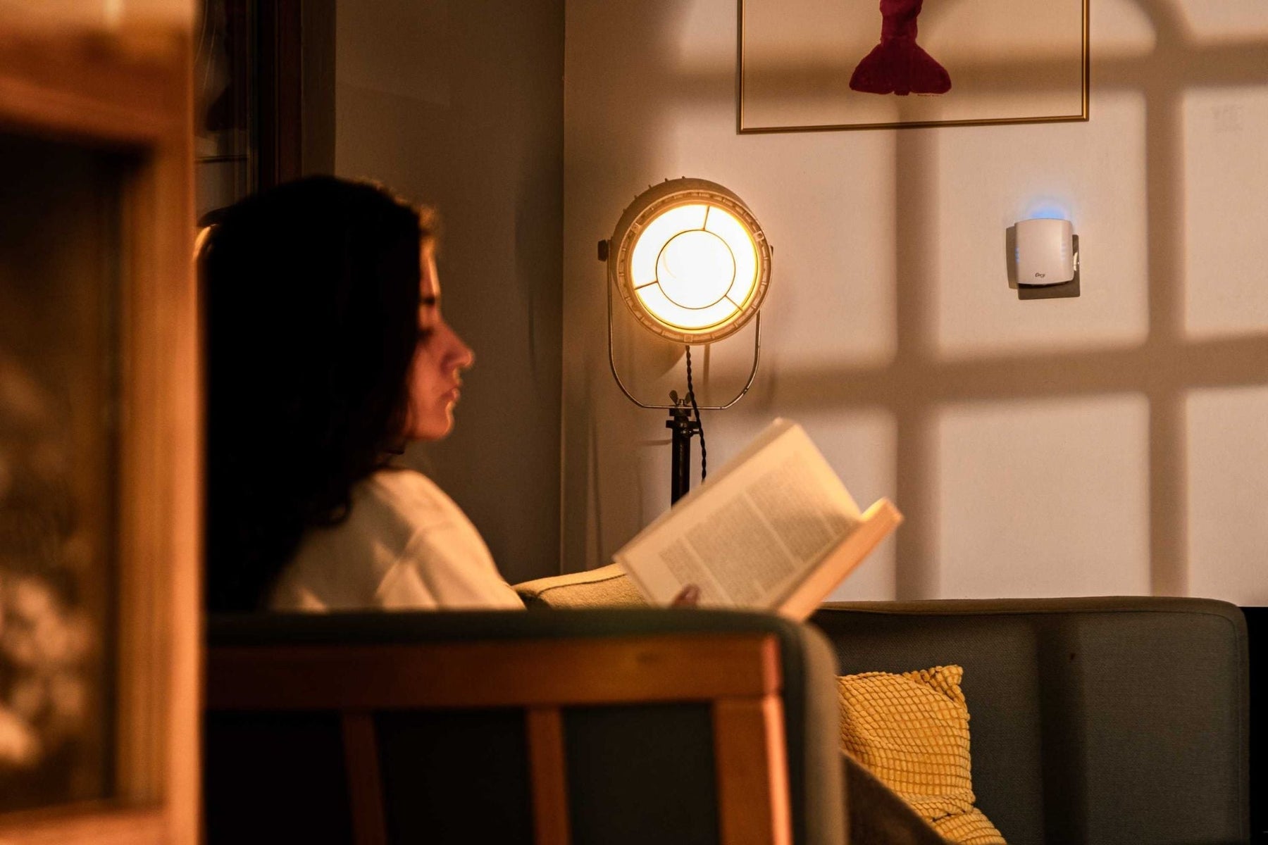 Erstelle eine Einschlafszene, in der der Cury Smart-Diffusor einen beruhigenden Duft abgibt und die LED sanft gedimmt wird, um die ideale Schlafatmosphäre zu schaffen.
