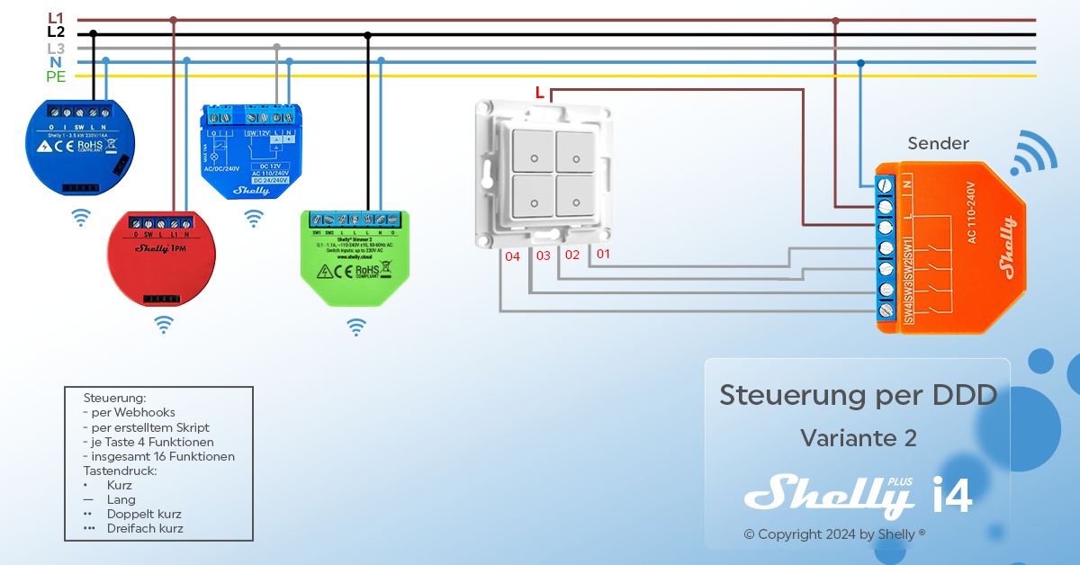 1. Frage: Kann man mit nur einem Taster mehrere Shellys ansteuern? Szenarion wäre nur ein einfacher Taster an der Wand und z.B. drei Schelly 1 Gen3 die jeweils eine Lampe schalten. Der Taster wird mit L verbunden und O1 geht auf die SW Eingänge aller drei Shellys. Dann so konfiguriert das 1x Klick Shelly Nr.1 seine Lampe einschaltet, nochmals 1x Klick Shelly Nr.1 schaltet seine Lampe wieder aus. 2x Klick Shelly Nr.2 schaltet seine Lampe ein, nochmal 2x Klick Shelly Nr.2 schaltet seine Lampe wieder aus. 1x Langer Klick schaltet Shelly Nr.3. Ist das machbar?